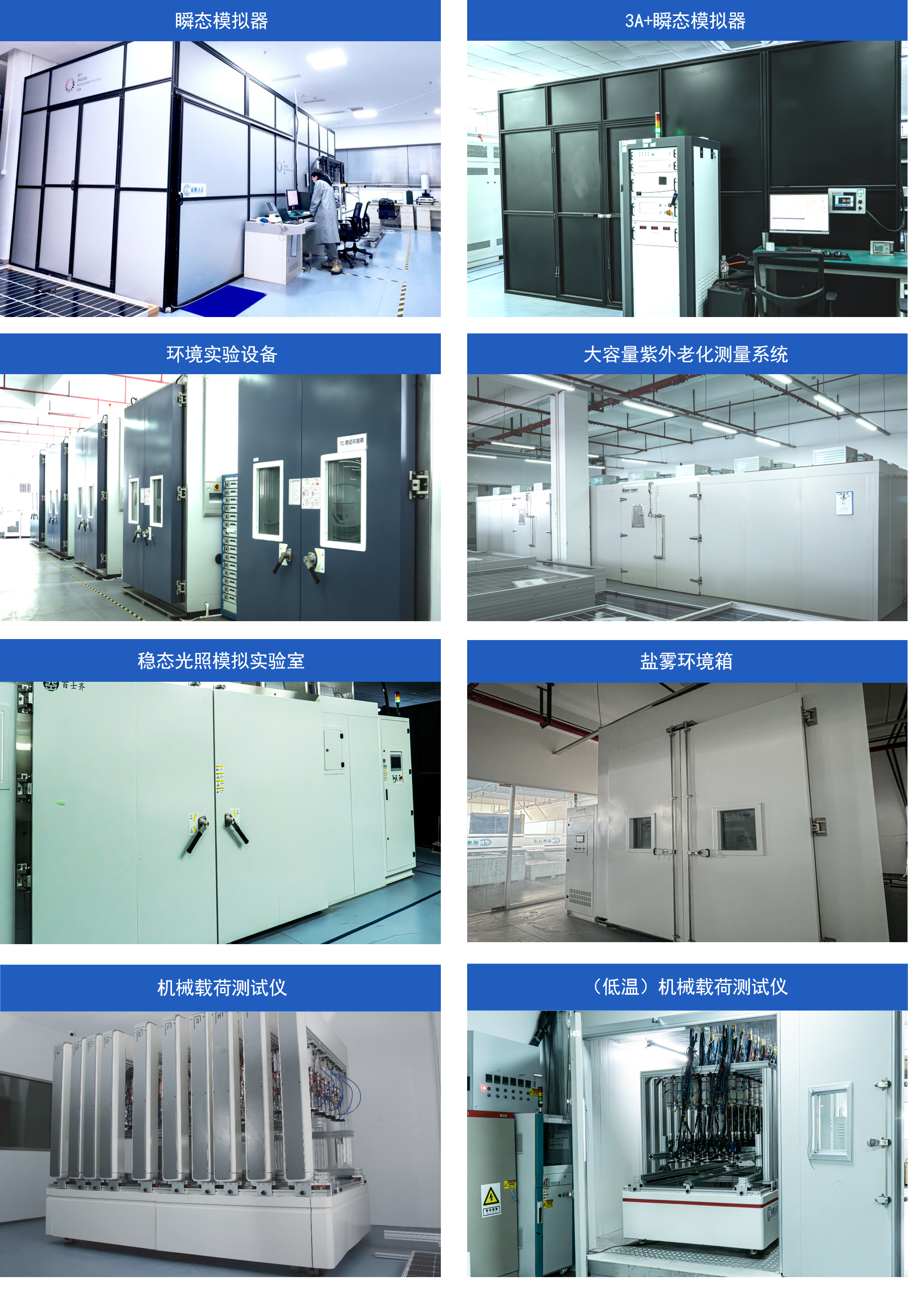 - 差異化測(cè)試:BIPV產(chǎn)品測(cè)試、鹽霧試驗(yàn)/氨氣試驗(yàn)/沙塵試驗(yàn)/不均勻雪載試驗(yàn)、高溫/低溫條件下的動(dòng)靜態(tài)機(jī)械載荷、包裝運(yùn)輸試驗(yàn)、加速老化測(cè)試、電致發(fā)光檢測(cè)(EL)/紅外檢測(cè)(IR)、LID/LeTID 測(cè)試、PID測(cè)試、組件發(fā)電特性相關(guān)測(cè)試和發(fā)電性能評(píng)定、電池片標(biāo)定/電池片光譜響應(yīng)